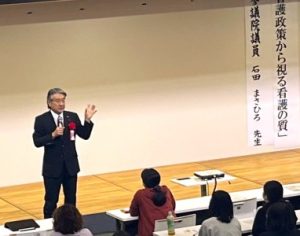 記録に追われる現場の状況、様式9や交代制勤務の課題等、現場に即した話から診療報酬改定の骨子、ご自身の看護師時代のエピソードなど様々なお話がありました。人口減少社会を迎える中、看護の質をどう担保するかヒントが詰まったお話でした。